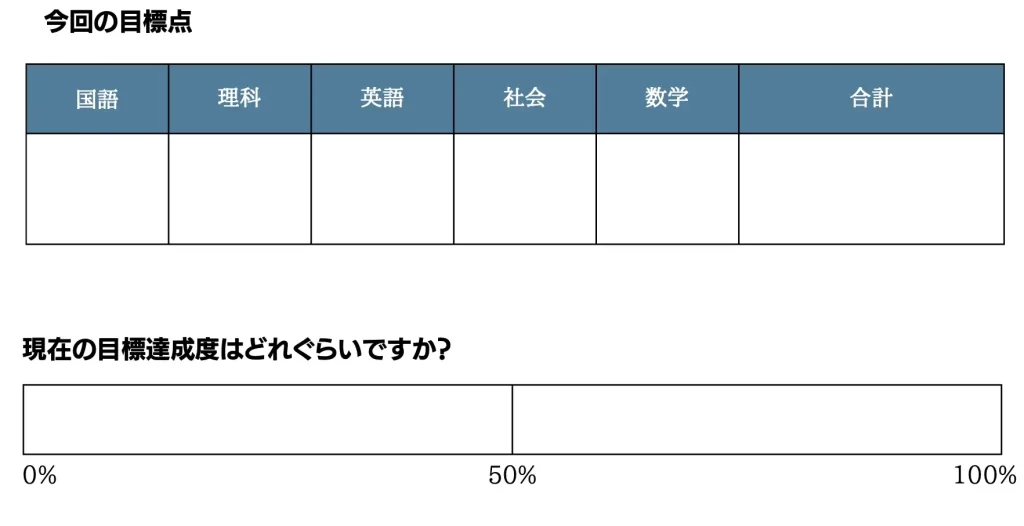 テストが残り1週間となってきたあたりで「目標確認シート」を書いてもらいました(´∀`)
