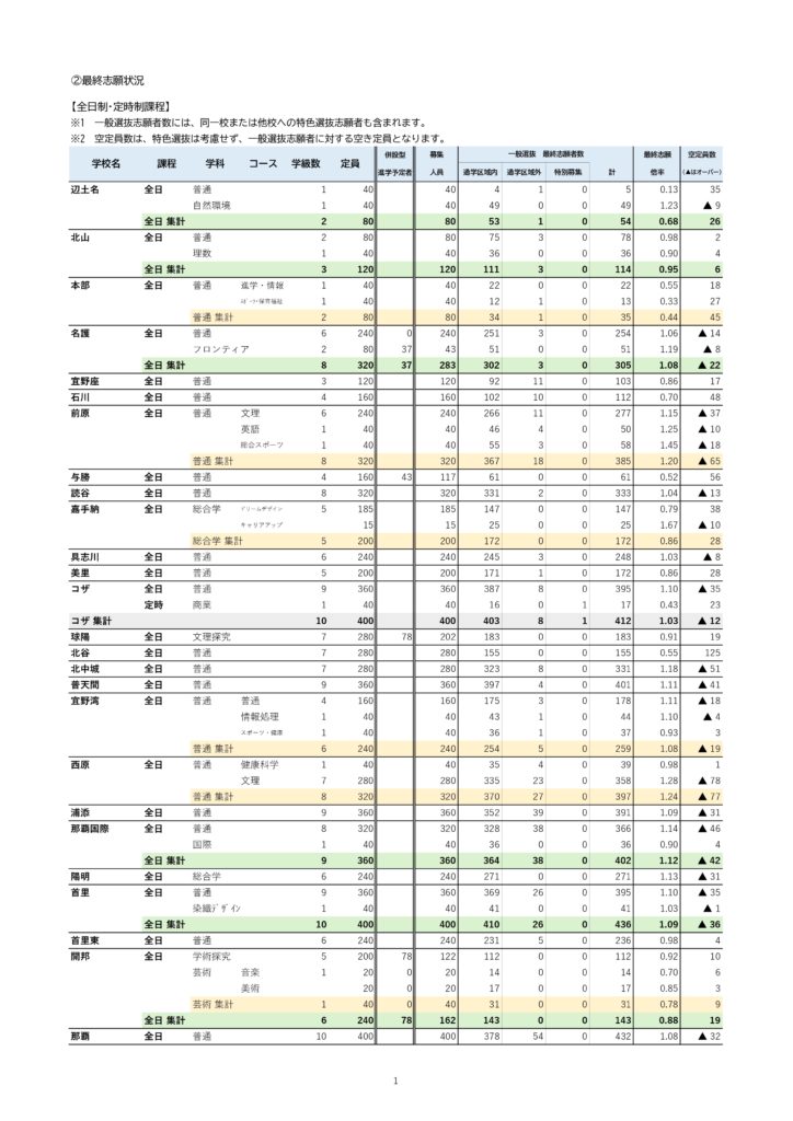 初回発表では、具志川高校が1.0倍を超え、さらに前原高校や北中城高校の倍率が急上昇するなど、例年とは異なる動きも見られました。