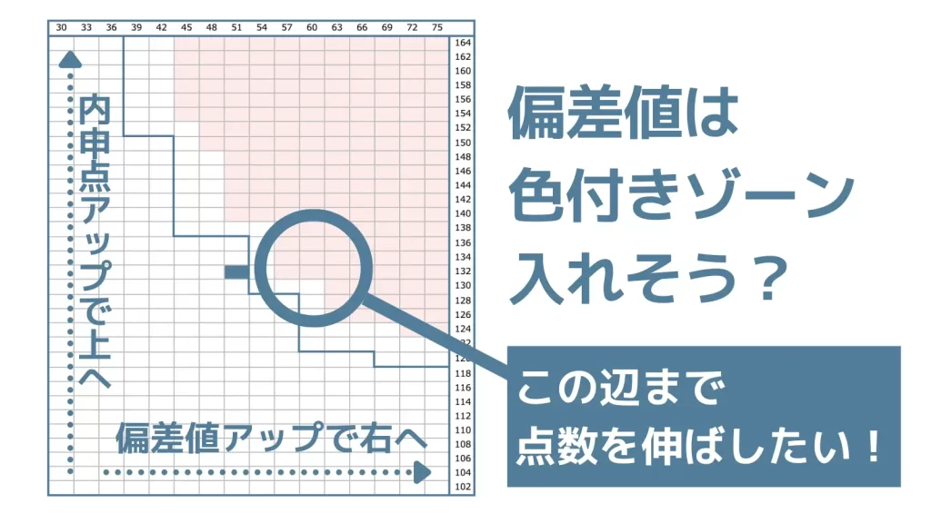 となるとまだまだ伸ばせる「偏差値」という部分に着目です!そう、偏差値を上げなければ右に移動できないのです!