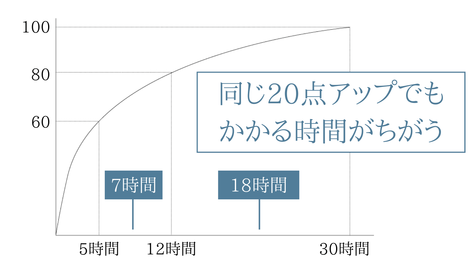 10時間で60点と20時間で80点と考えると、点数アップにかかる時間が変わってくることがわかります。