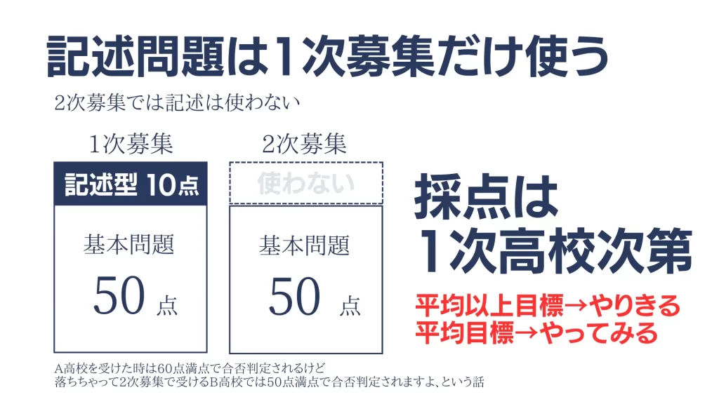 そのため、1次募集の高校では自校にあわせて記述型問題の採点をすることができます。そこから受験校によって採点基準が異なるだろうと予想できるのです。