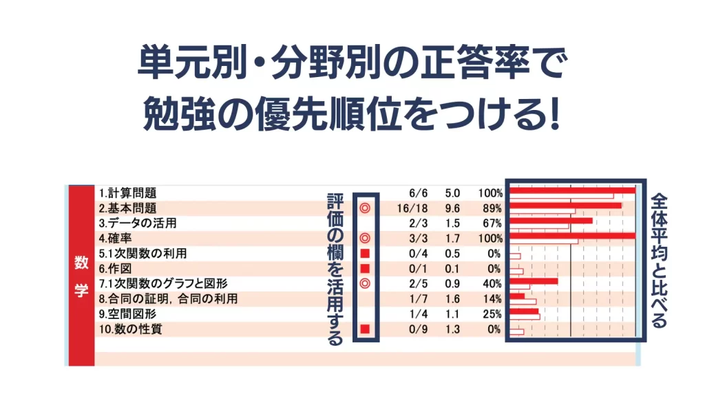 平均よりとれているかどうかを基準にしながら勉強する必要のある部分を探していきます。