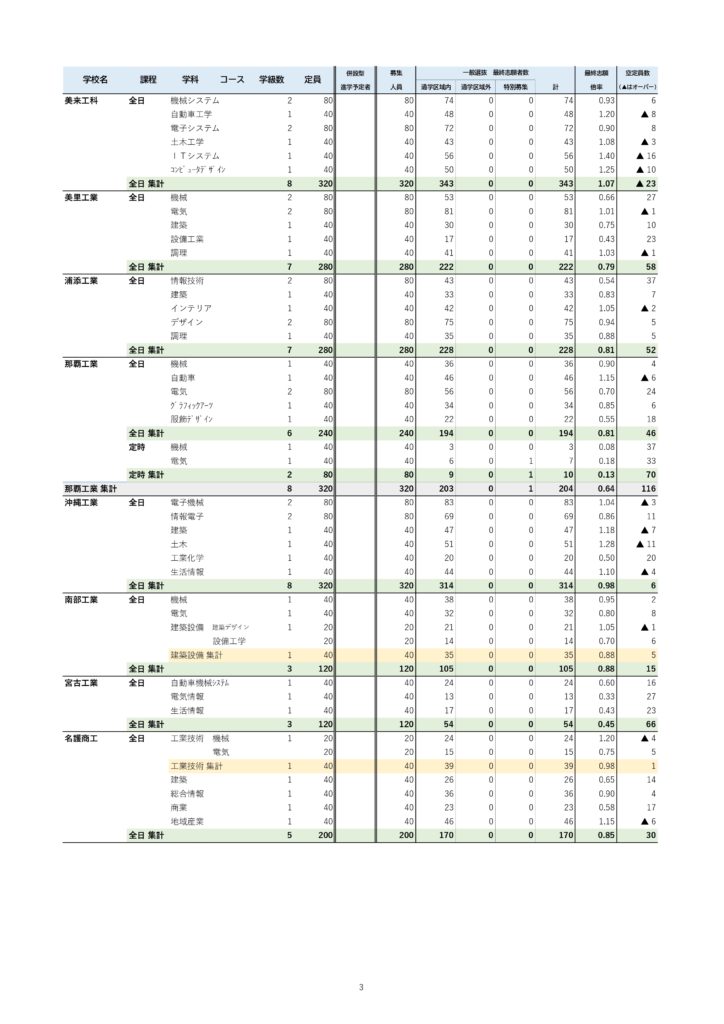 成績でいえば中間あたりの生徒が一番多いので、中堅校に受験者が集中するのは自然なことです。ここに「実業系高校の人気低迷」が加わることで前原、北中城の倍率が高くなってきています。