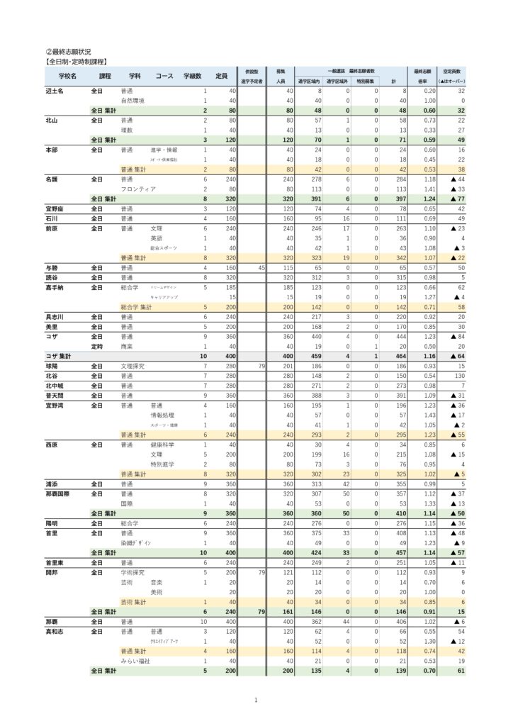 初回発表では、具志川高校が1.0倍を超え、さらに前原高校や北中城高校の倍率が急上昇するなど、例年とは異なる動きも見られました。